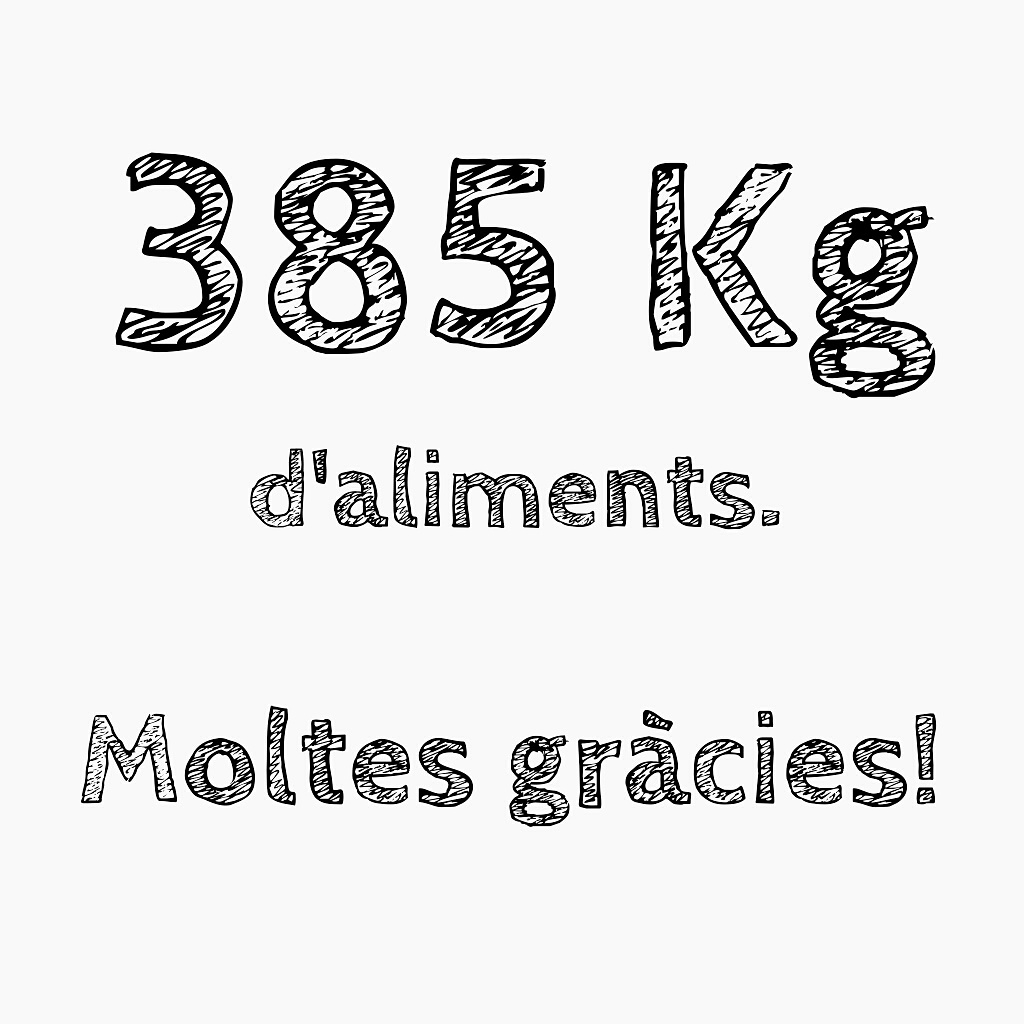 Entre més de 150 persones de públic vam aconseguir omplir més de 30 caixes plenes de menjar i el resultat… 385 Kg d’aliments per ajudar a qui més ho necessita!